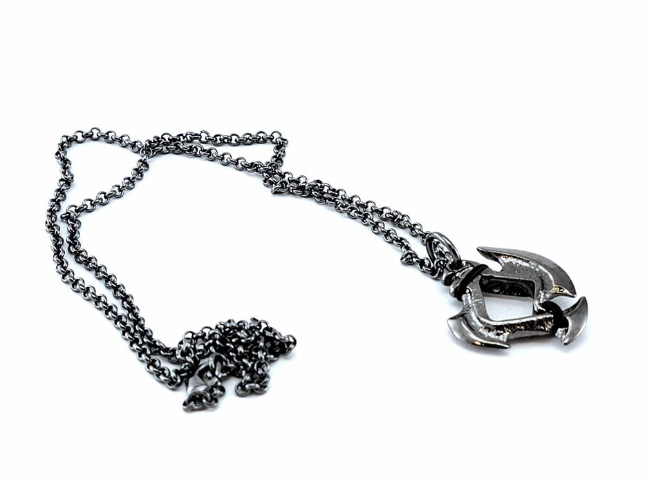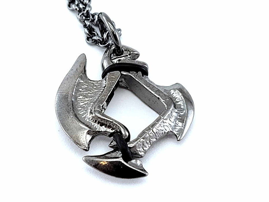 - The necklace has a gunmetal gray finish and the pendant looks like an axe blade. Dice not included.
