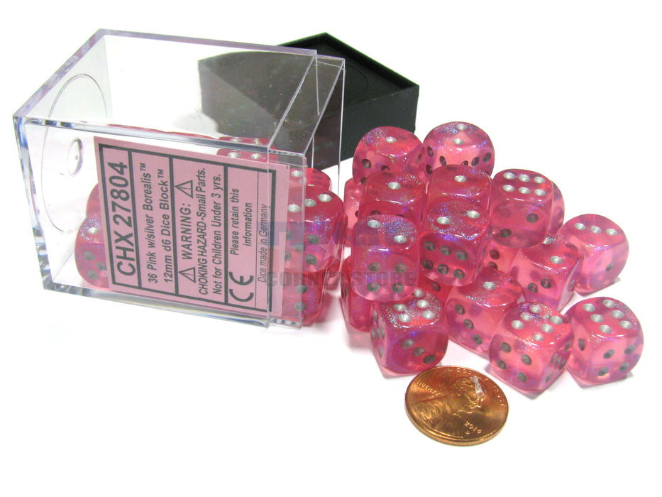 Borealis 12mm D6 Chessex Dice Block (36 Dice) - Pink with Silver Pips
