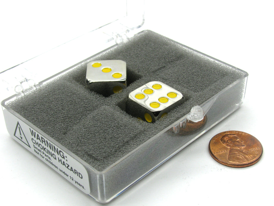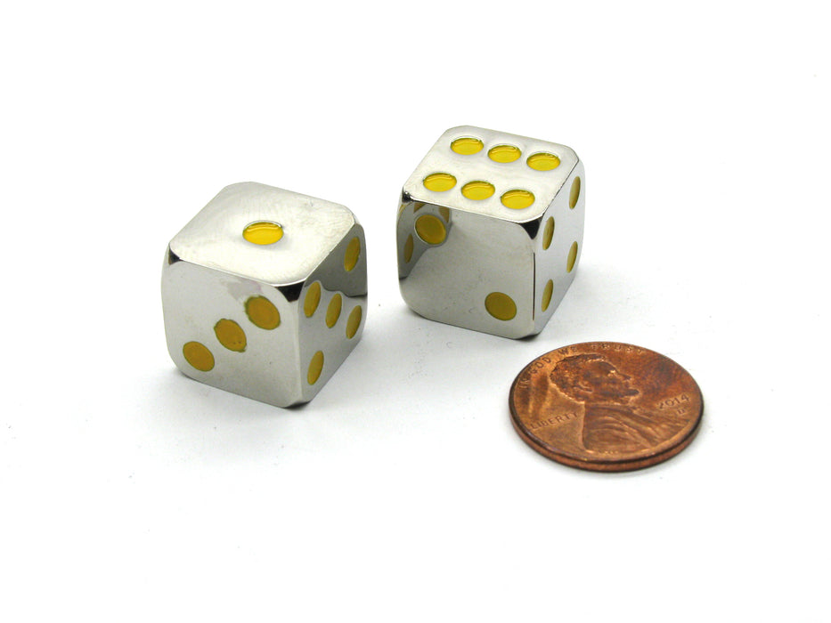 Box of 2 Zinc Metal Alloy D6 15mm Heavy Dice - Yellow Pips