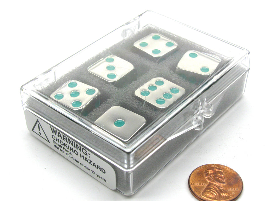 Box of 6 Zinc Metal Alloy D6 15mm Heavy Dice - Green Pips
