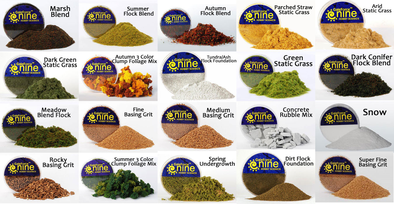• Arid Static Grass: The grass isn’t always greener on the other side… Gale Force Nine’s Arid Static Grass is perfect of all those dead, dried out, war-torn places where battles are so often fought. Deserts, scrub lands, and abandoned urban lots all look great with a few patches of yellowed, dried out grass. You can also use Arid Static Grass alongside autumn foliage for great early winter bases, snow for winter scenics, or green foliage for early spring bases.