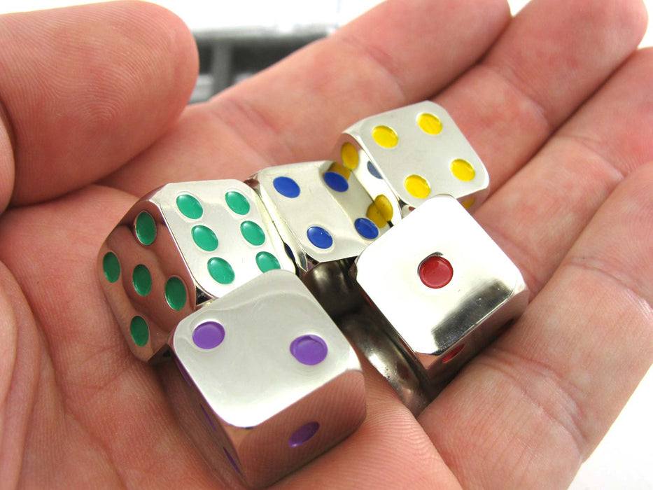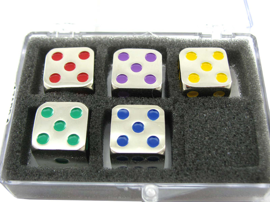 Pack of 5 D6 15mm Metal Dice - Silver with Blue, Green, Purple, Red, and Yellow
