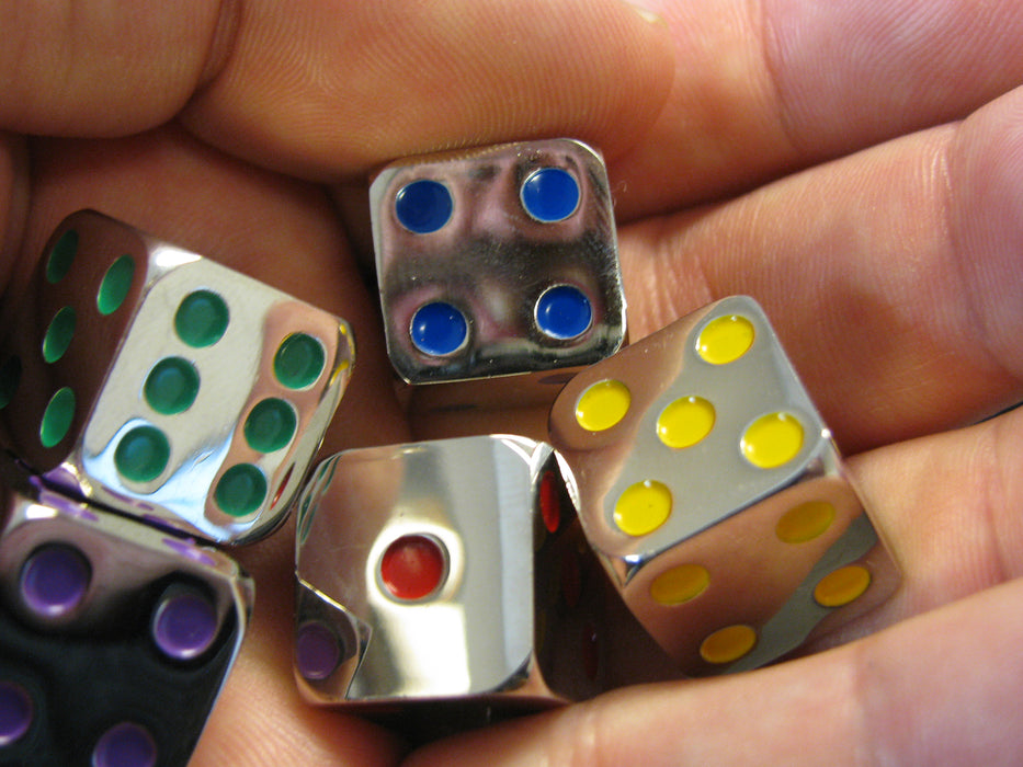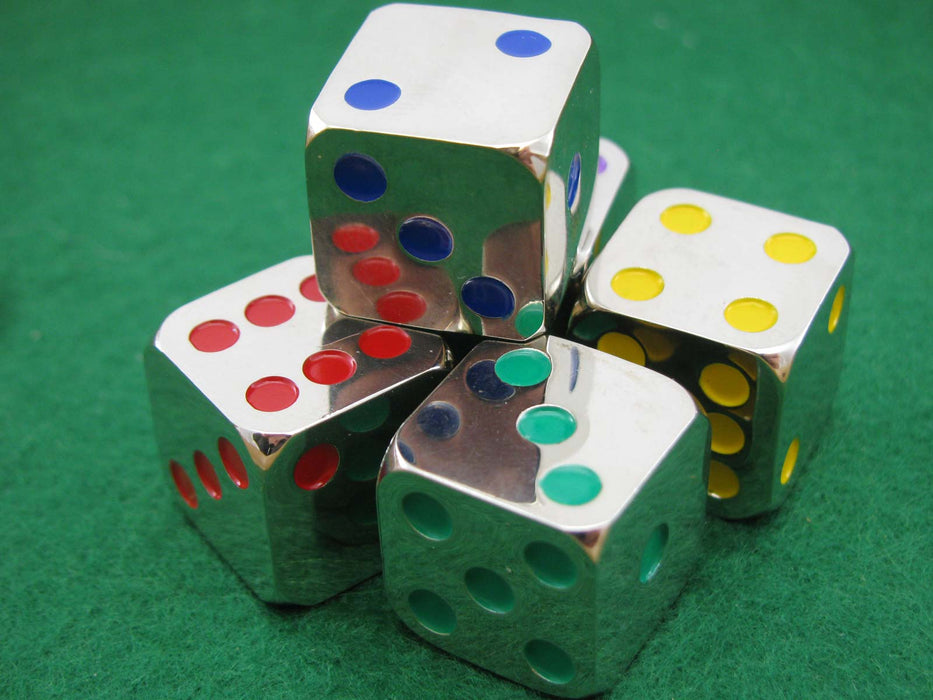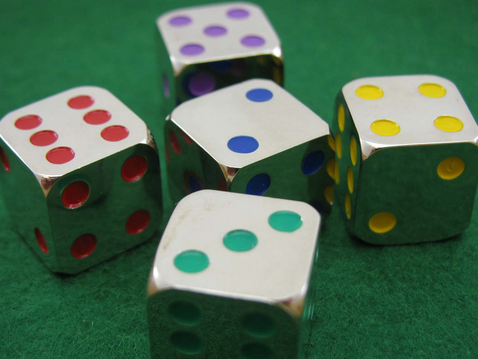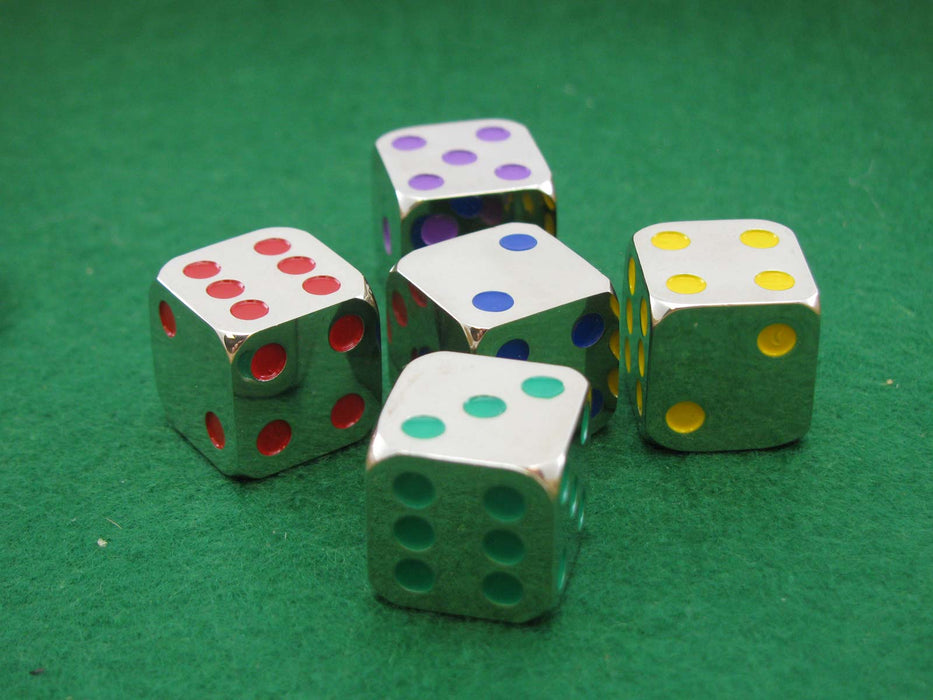 - Includes 5 dice, 1 of each with pips colored: blue, green, purple, red, and yellow