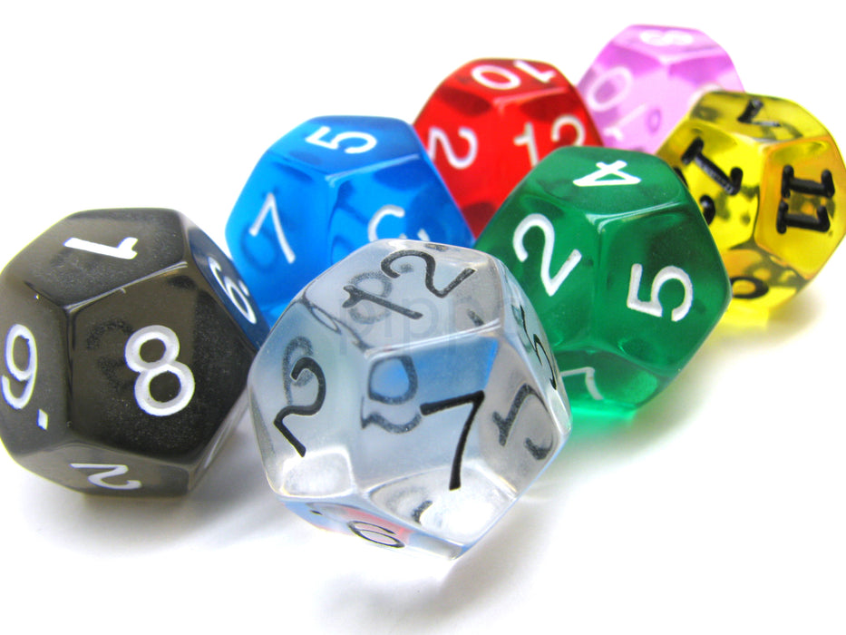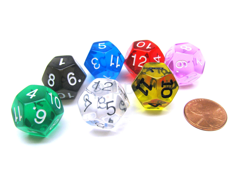 Pack of 7 Transparent D12 20mm Dice - Blue Clear Green Orchid Red Smoke Yellow