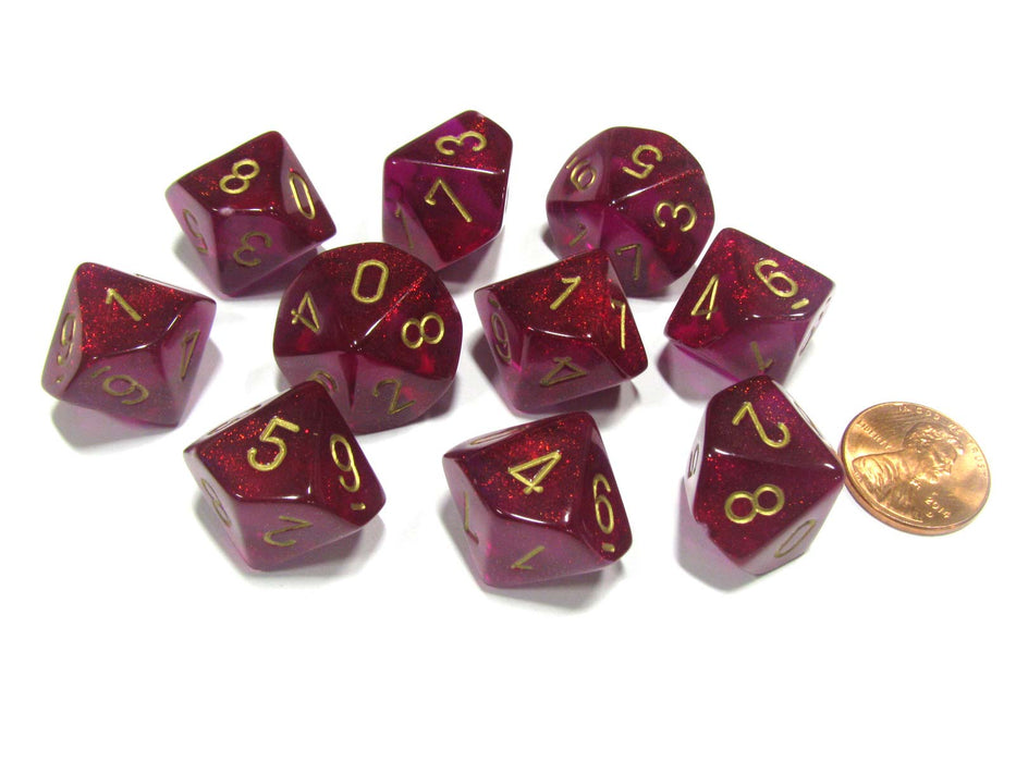 Set of 10 Chessex Borealis D10 Dice - Magenta with Gold Numbers